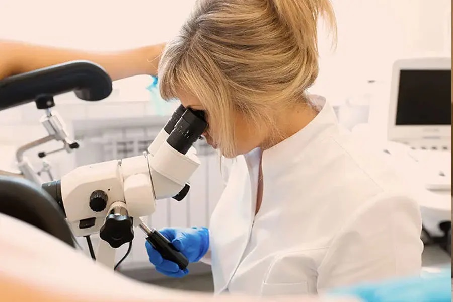 - متخصص زنان به کمک دستگاه کولپوسکوپ با بزرگنمایی، دهانه رحم و داخل واژن را بررسی میکند.